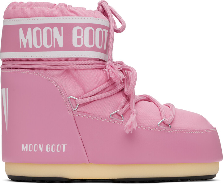 Moon Boot Pink Icon Low Nylon Boots Ankle-high insulated buffed faux-leather and nylon canvas boots in pink. · Water-repellent · Lace-up closure · Drawstring at collar · Logo printed at sides and heel · Fleece lining · Lightweight rubber platform midsole · Treaded rubber sole · Platform: H2 Supplier color: Pink